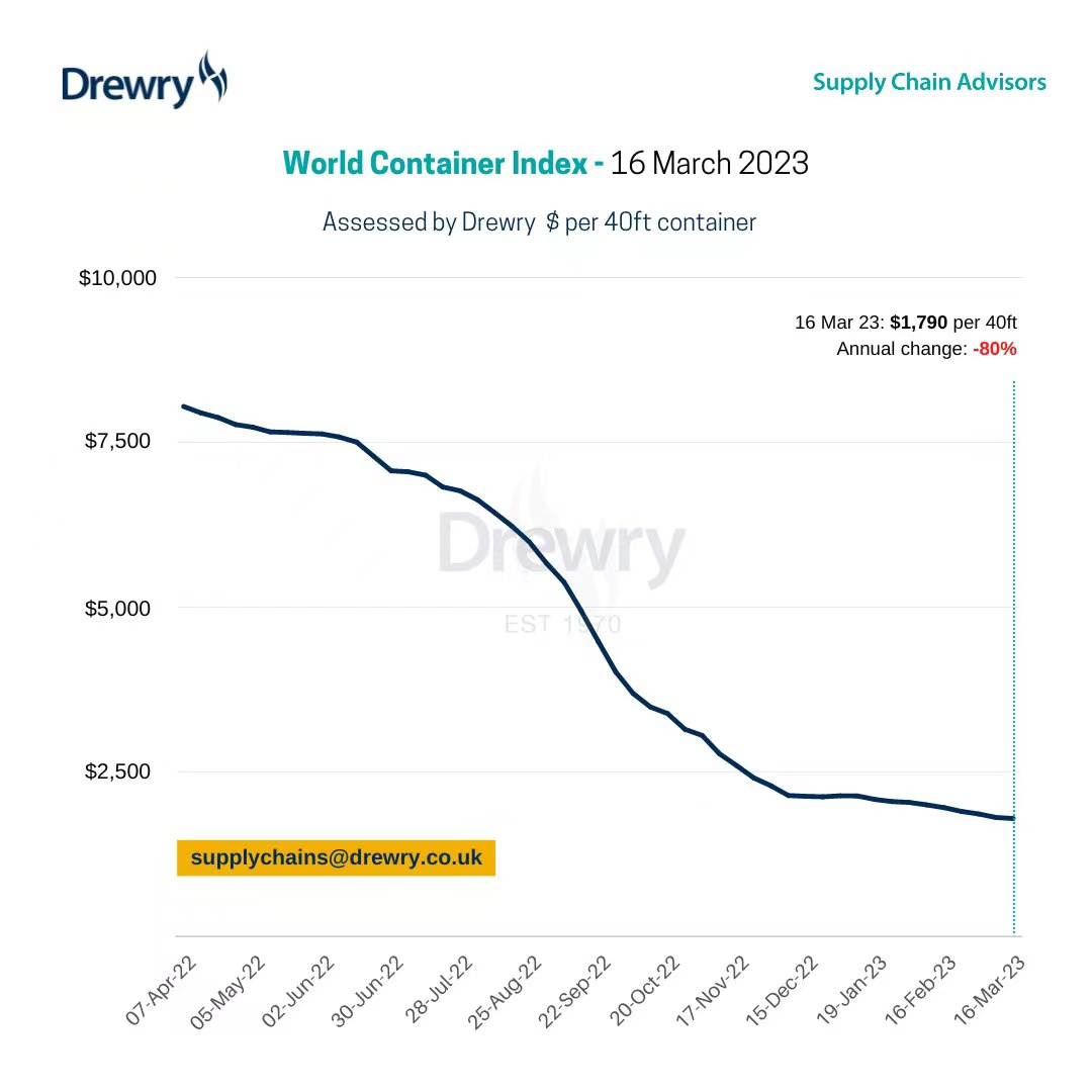 The latest Drewry WCI composite index of $1,790 per 40-foot container is now 83% below the peak of $10,377 reached in September 2021. It is 33% lower than the 10-year average of $2,691, indicating a return to more normal prices, but remains 26% higher than average 2019 (pre-pandemic) rates of $1,420.