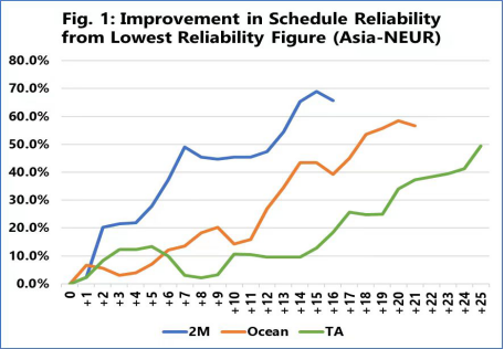 Figure 1 covers the Asia-North Europe trade lane. "In just the second month after dropping to its lowest point, 2M had improved schedule reliability by 20 percentage points, whereas the improvements for Ocean Alliance and THE Alliance were both under 10 percentage points," pointed out Sea-Inteligence analysts.