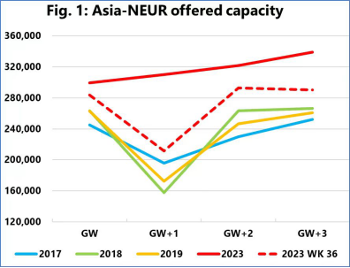 Figure 1 depicts the development in Asia-North Europe, with the red line representing the scheduled capacity for the 2023 Golden Week (+3 weeks), as it stood two weeks ago in week 43, compared to the same period in 2017-2019, as the pandemic years of 2020-2022 are too volatile to be used as a reasonable benchmark.