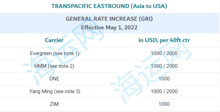 Note 1: Evergreen GRI charges $1,000 per 40 ft container and $2,000 per refrigerated container. The GRI of all other sizes of containers is converted according to the formula.