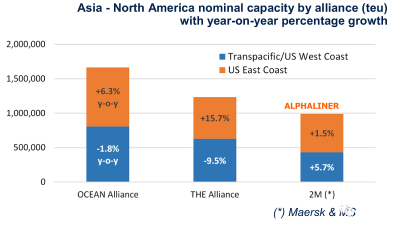 Maersk's 38.7% year-on-year growth was due to the launch of a separate Asia-East US "TP20" route based on customer demand, as well as "TPX" and "TP28" to the West Coast. Its capacity on the Asia-North America 2M route increased by 11.5%, while additional service capacity outside 2M increased from 14,660 TEU to 201,260 TEU.