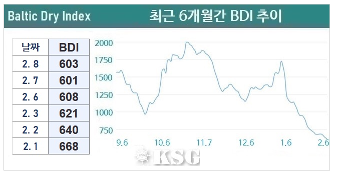 2?8? ???? ????(BDI)? ???? 2??? ??? 603?? ????. ?? ????? ????? ??? ??? ??? BDI? 1???? ??? ????. ???? ??? ?? ?? ?????, ????? ??? ??? ????.