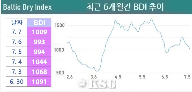 7?7? ???? ????(BDI)? ???? 16??? ??? 1009? ????. ?? ? ?? ??? ? ?? ?? ???? ???? ?? ?? ??? ??? ??? ????. 7?5?? 6? BDI? 1000? ??? ?????, 7? ?? 1000?? ????. ??? ???? ????(KDCI)? 7?7? ?? 1?761??? ???? 15?? ????.